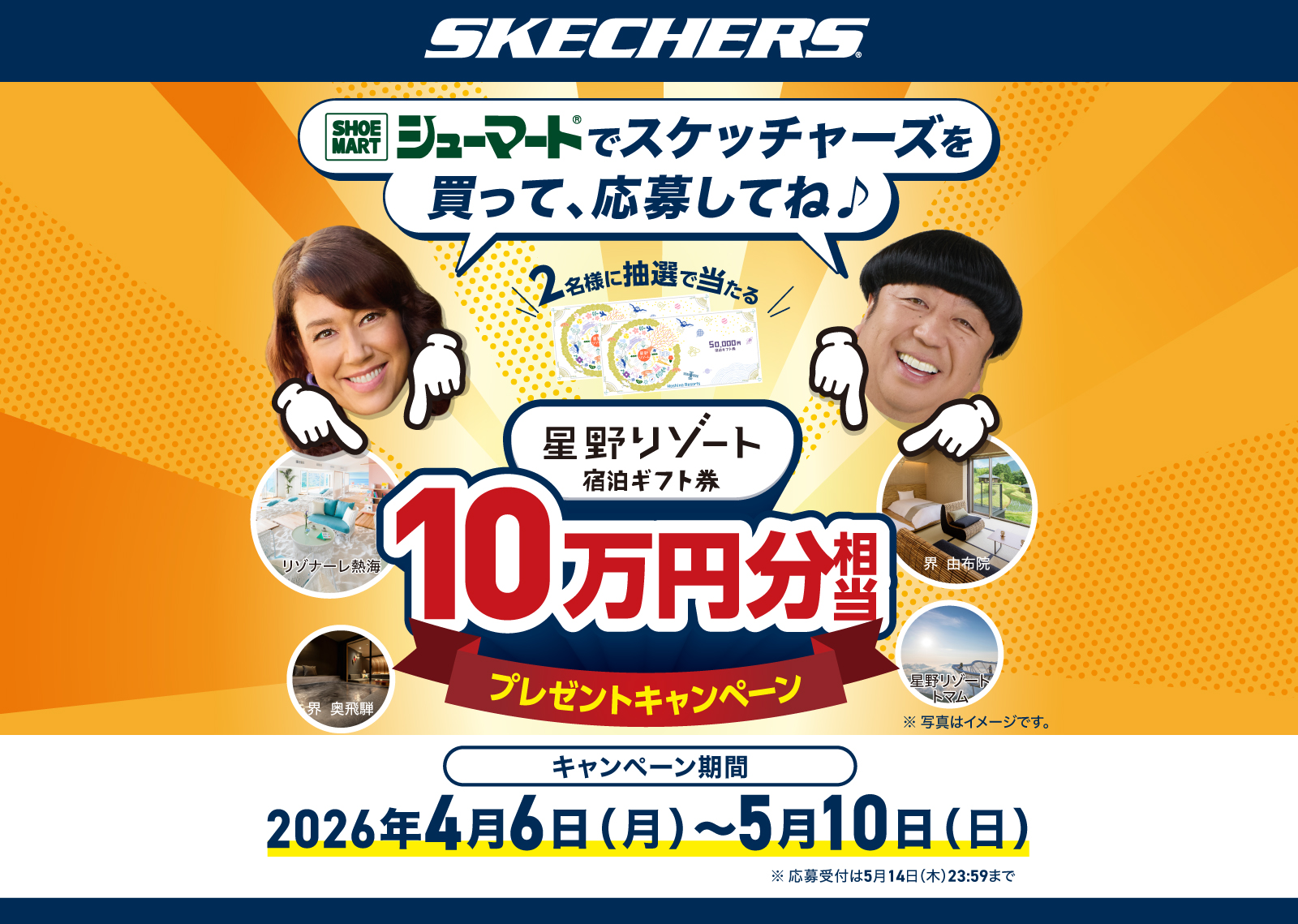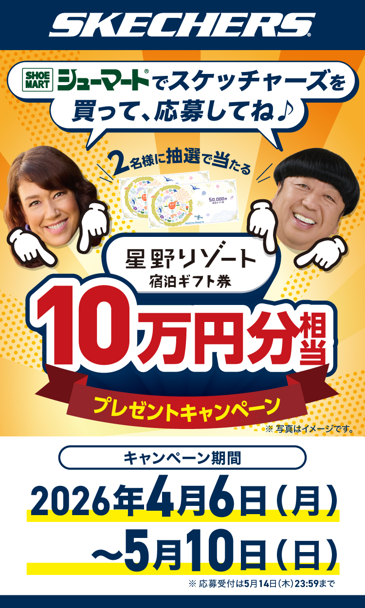 スケッチャーズ商品を各店舗にて一回のお買い物で5,000円(税込)以上ご購入のうえ、下記応募フォームよりご応募ください。